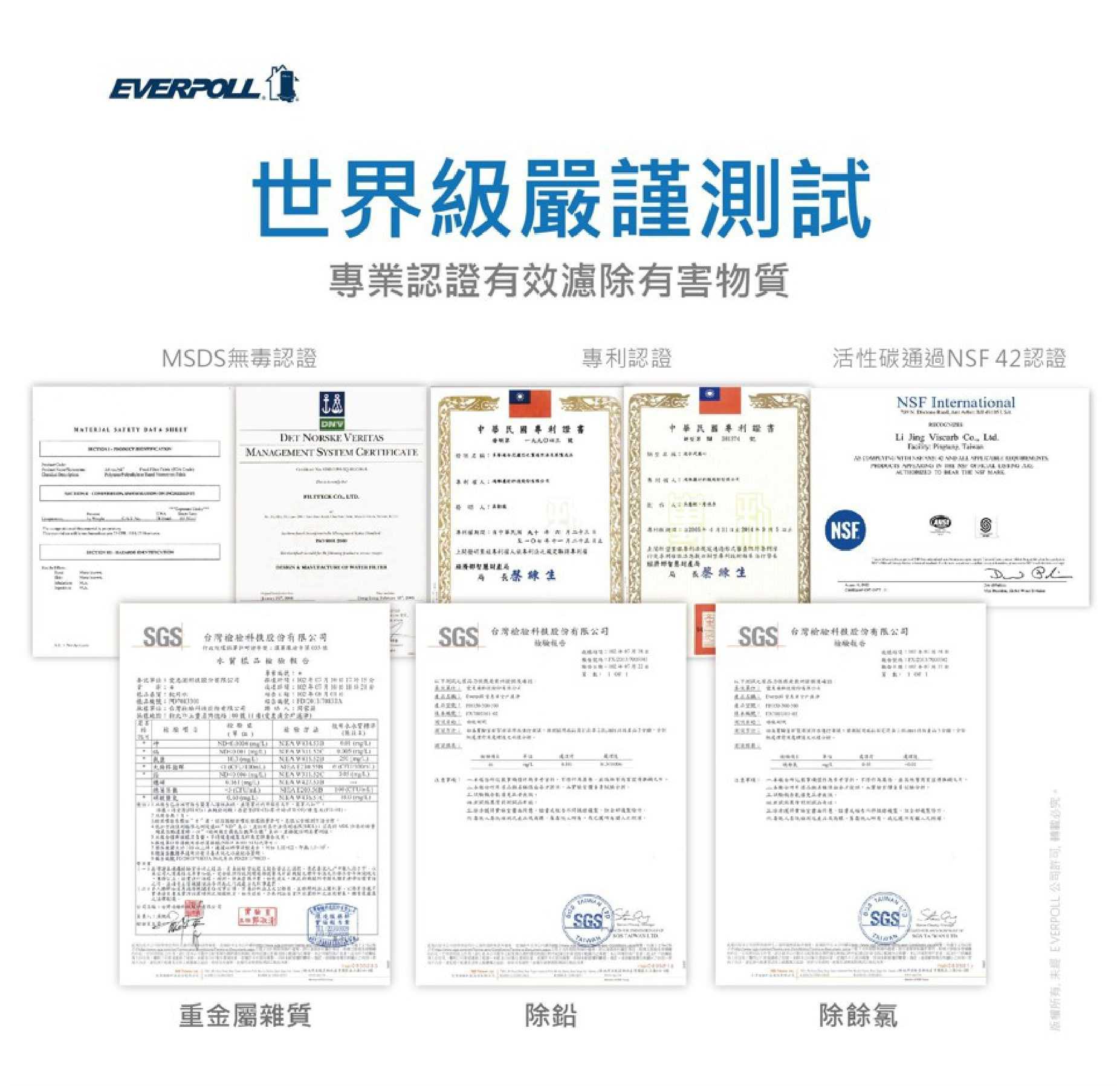 全屋濾淨以單道複合式過濾為全球技術發明者,經多手改良及試驗,一直為市場上此品項的領導品牌、其他品牌均無法取替 研發製造產品經瑞士日內瓦 SGS 檢驗通過並取得 ISO 9001 國際標準化製造管理認可,優越濾材效率更榮獲美國國家衛生基金會 NSF 42 及美國國家表準協會 AN SI 的高標準認證,並通過第一級最嚴格超精密飲用水標準與美國環保局 (EPA) 測試驗證