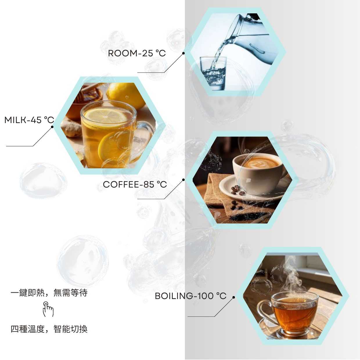 室溫(25°C)*、蜂蜜水(45°C)、咖啡(85°C)、滾水(100°C)——一鍵切換,滿足你各種用水需求。