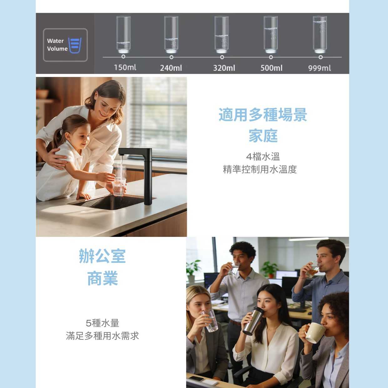 150ml、240ml、320ml、500ml、999ml 五檔熱出水模式,沖咖啡、杯麵、沖茶,水量啱啱好。