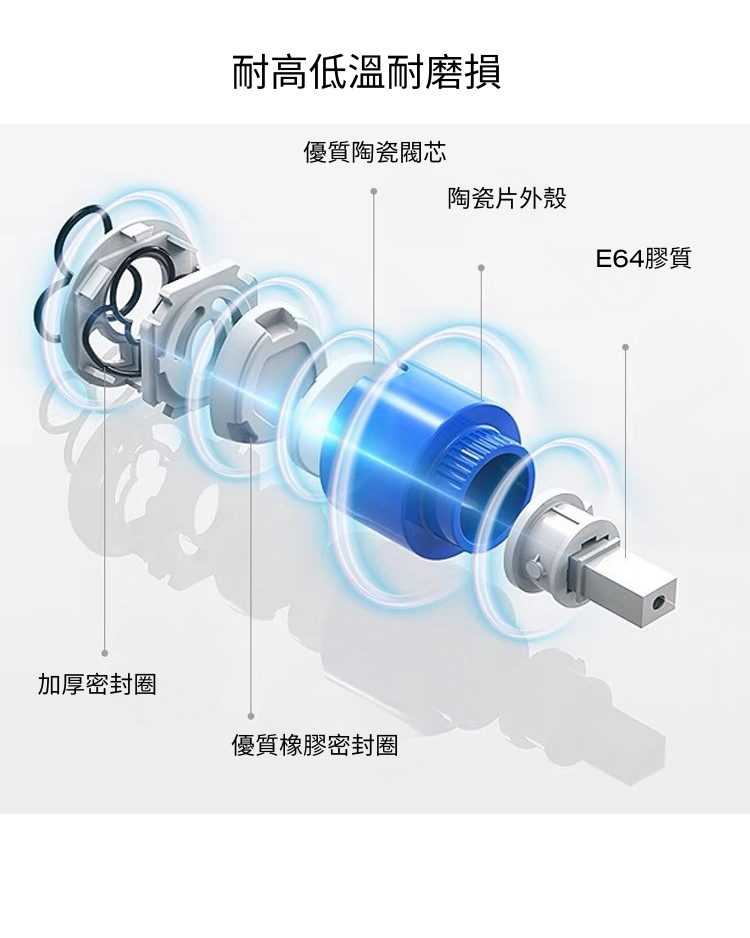 (1)採用精密的陶瓷閥芯,硬度大,陶瓷閥芯質量高、手感舒適輕快,操作順暢省力,耐久不漏水。