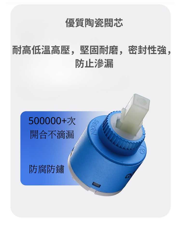 (1)採用精密的陶瓷閥芯,硬度大,陶瓷閥芯質量高、手感舒適輕快,操作順暢省力,耐久不漏水。