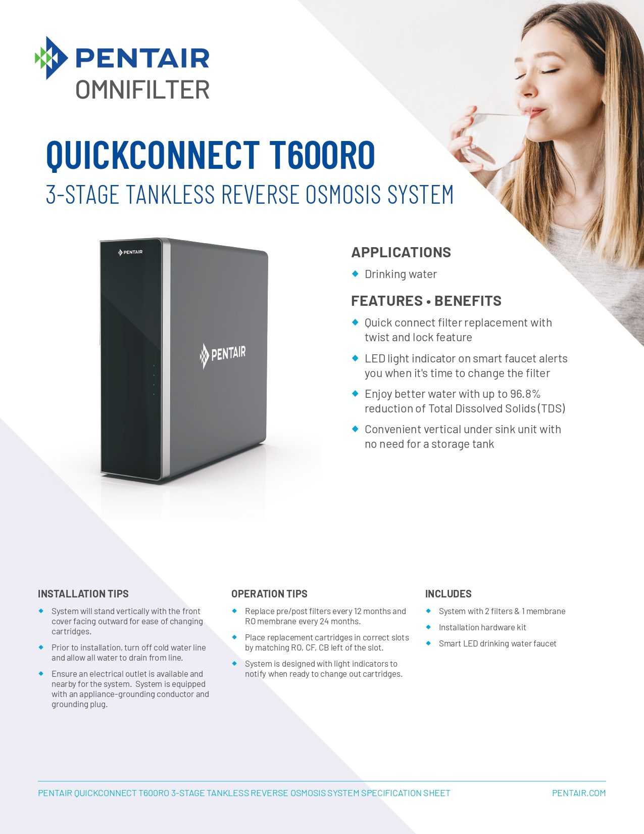 Pentair OMNIFilter QuickConnect 無水箱逆滲透淨水器是一款設計時尚現代的緊湊型廚下式無水箱逆滲透淨水系統。